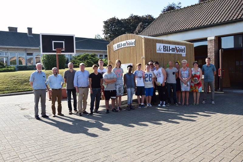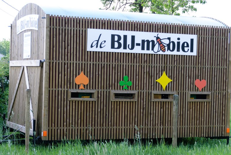 Met behulp van de provinciale subsidies voor biodiversiteitsprojecten konden we in samenwerking met Buso-school ‘De Dageraad’ uit Borgloon een werfkeet laten ombouwen tot een mobiele bijenhal, zgn. de ‘Bij-Mobiel’. Deze zal gebruikt worden voor educatieve doeleinden en als blikvanger voor het bijenleven en hun bestuivingswerk naar het grote publiek toe. Zowel de honingbij als de solitaire bijen krijgen hierbij de volle aandacht. Voor raad en advies konden we rekenen op het Provinciaal Natuurcentrum en de imkers dhr. Jos Moors en dhr. Ludo Moens. Zij waren dan ook nauw betrokken bij de ontwikkeling van de ‘Bij-Mobiel’.