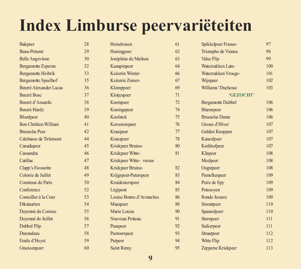 Dit boek heeft als hoofddoel om de lezer te laten kennis maken met de rijke fruitcultuur van de provincie Limburg. Vooral de vele en diverse variëteiten verdienen onze aandacht. Sommigen kenden een regionale of zelfs een internationale verspreiding, maar vele andere kwamen enkel zeer lokaal voor. Van 84 perenvariëteiten vonden we nog voldoende historische bronnen terug om ze te bespreken in dit naslagwerk. We konden een volledige pomologische beschrijving geven van 63 variëteiten omdat de NBS hiervan nog enthout heeft kunnen verzamelen en productieve bomen heeft in haar collecties. Van iedere variëteit worden synoniemen, herkomst, boom-, vrucht- en typische soortkenmerken weergegeven, alsook de productiviteit, gevoeligheden, rijptijd, gebruik, bestuiving, ... Dit alles geflankeerd door afbeeldingen van vruchten, getekende doorsneden en soms een beeld van de boom zelf. Van 21 anderen, nog 'gezochte' variëteiten hebben we nog wel historische bronnen of referenties, dikwijls nog enkele oude foto's of litho's, maar missen we vandaag de vitaal groeiende bomen om een goede beschrijving te kunnen maken van hun groei en productie. Het gaat hier veelal over de typische stroopperen en lokale eigenheden van de jaren 1900 tot 1945, waarvan de misschien laatste exemplaren verdwenen zijn, vooraleer ze verder vermeerderd konden worden... Omtrent de nog gezochte variëteiten verwachten we van u lezer, de nodige ruggensteun. Wil u ons zoveel mogelijk eventuele standplaatsen, gegevens van de variëteiten zelf, hun herkomst, oude getuigenissen, enzovoort bezorgen. Kortom, ieder klein detail kan bij onze zoektocht belangrijk zijn.