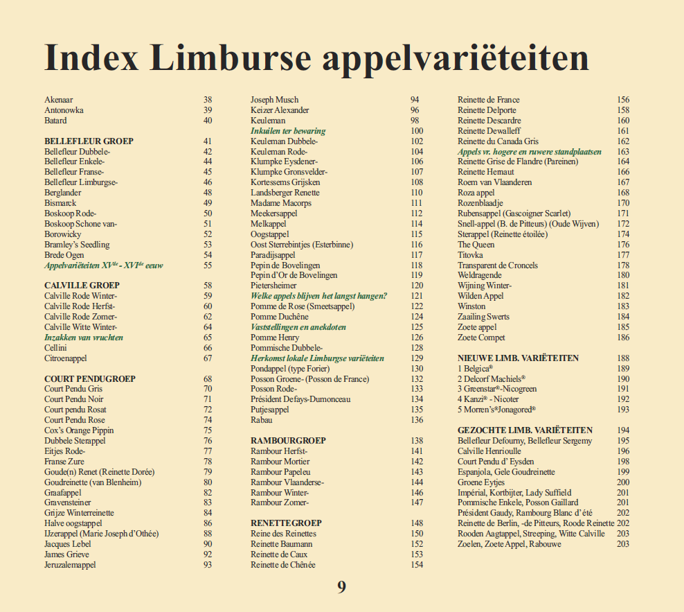 De hoofdbrok wordt gevormd door het hoofdstuk Hoogstamappelvariëteiten in Limburg vroeger en nu. Van meer dan honderd appelvariëteiten worden de kenmerken van vrucht en boom beschreven, samen met specifieke eigenheden of gebruiksmogelijkheden. Van een aantal appelvariëteiten die vroeger in de Limburgse boomgaarden voorkwamen, beschikt de Boomgaardenstichting over te weinig gegevens of zijn