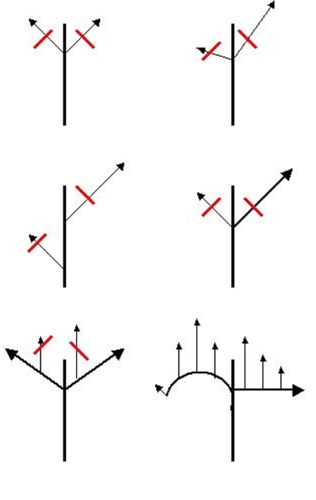 1. Takken met gelijke hoogte en hoek groeien even hard 3. Hoger geplaatste takken groeien harder 5. Kort bij de stam is er meer groei |