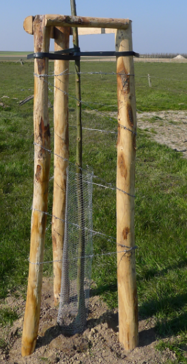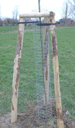 De schofthoogte van rundvee is bovendien lager dan deze van (rij)paarden, waardoor ze niet zo hoog kunnen reiken. Een standaardbescherming kan er dan ook eenvoudiger uitzien. De bescherming die wij reeds enkele jaren met goed gevolg gebruiken voor de diverse aanplantprojecten, met lichte tot gemiddelde veebezetting, ziet er als volgt uit:
