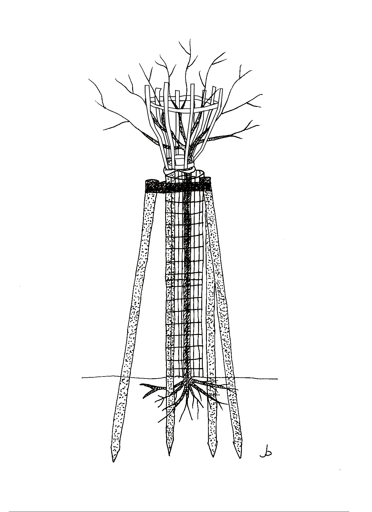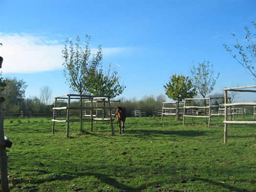 In een permanent door paarden begraasde weide wordt rond voornoemde constructie best een kooi geplaatst uit 3 palen met een lengte van 2,5 m en een doormeter van 10 cm, 70 cm diep ingegraven, waarbij de onderkant van de kooi groter is dan de bovenzijde. De drie palen worden bovenaan onderling verbonden met dwarslatten van 60 cm en spiraalvormig met prikkeldraad omwikkeld.