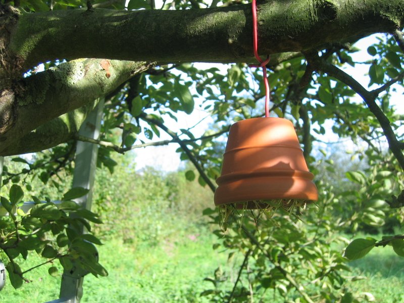 de schade echter zo groot zijn dat een ingreep verantwoord is. - Hang met hooi gevulde omgekeerde bloempotjes die je eerst enkele dagen onder een ruige perceels- of haagrand