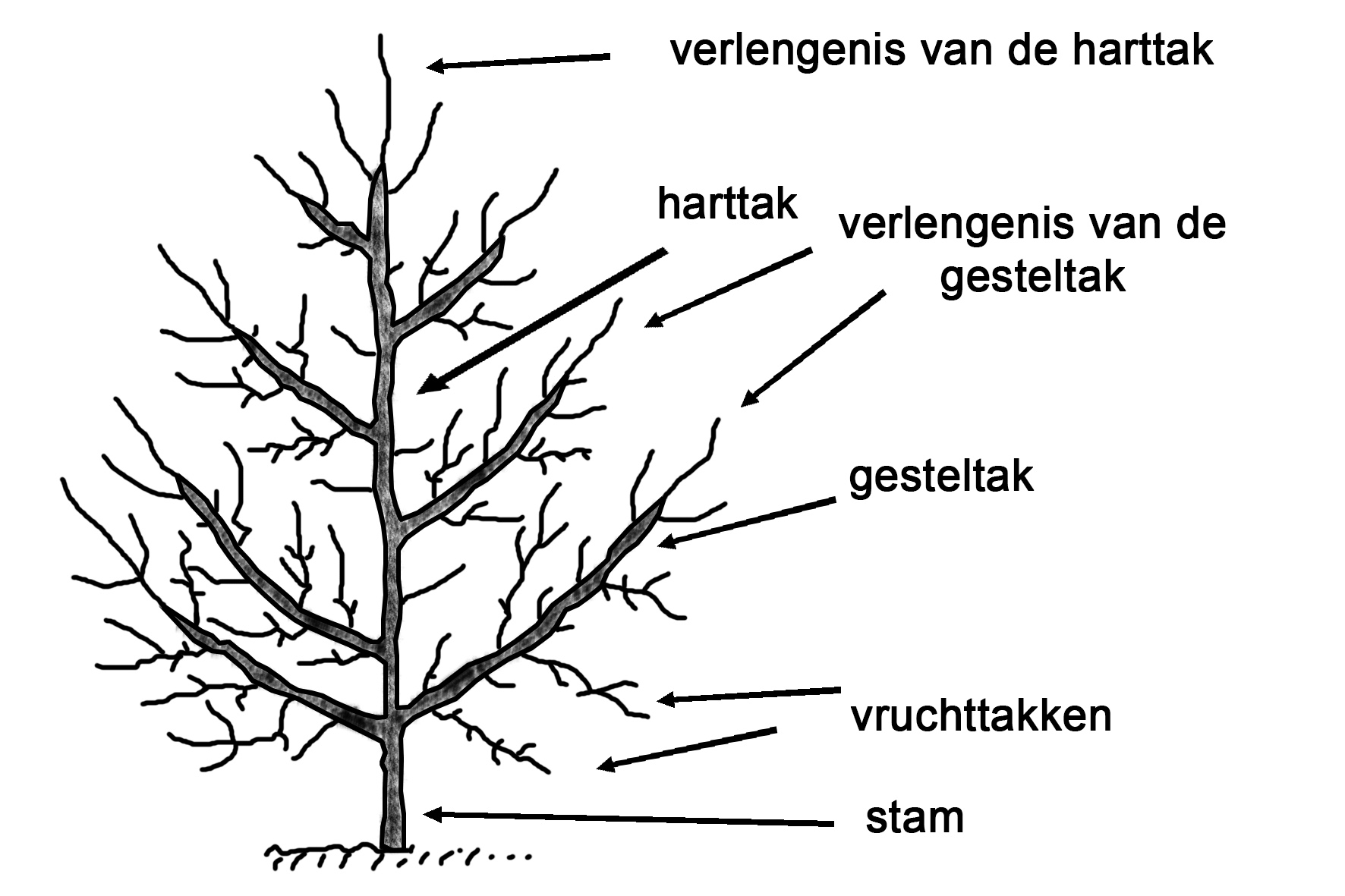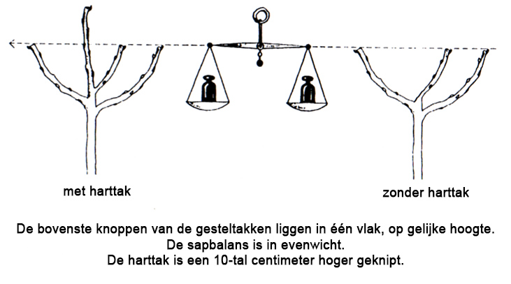 Zo zullen de gesteltakken en de harttak het volgende jaar ongeveer even sterk en in dezelfde richting groeien. Soms kan het ook gebeuren dat de te snoeien takken te scherp staan ingeplant (< 45°) en concurrenten zijn van de harttak. Normaal dienen deze gesteltakken onder een hoek van ongeveer 45° te staan t.o.v. de harttak. Soms kan het ook zijn dat ze te horizontaal (> 45°) staan en daardoor te zwak ontwikkeld zijn. Heeft u met dit probleem te maken, dan moeten de gesteltakken eerst uitgebogen of opgespannen worden, alvorens u ze gaat terugsnoeien.