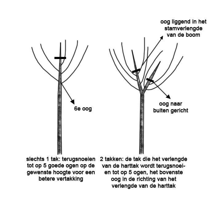 Heeft de kruin slechts 1 tak (harttak), dan snoeien we terug tot op 5 goede ogen die op de gewenste hoogte liggen. Voor een hoogstam ligt het eerste oog dan op ongeveer 2,20 m en voor een halfstam is dit ongeveer 1,50 m. Wil men daarnaast ook nog een goede vertakking naar de breedte toe, dan breekt men het 6de oog en de 2 ogen onder de 5 goede uit.