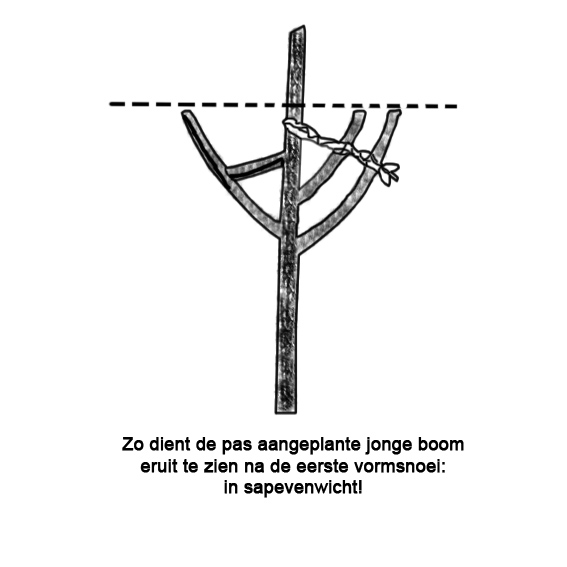 Een pas aangeplante of verplante boom dient steeds gesnoeid te worden, omdat bij planten of verplanten een deel van de wortels onherroepelijk wordt beschadigd of afgerukt. Op dat moment zijn de wortels niet meer in staat om de volledige kruin te voorzien van een even grote sapstroom (voeding) als voor de aanplant. Om ervoor te zorgen dat er opnieuw een evenwicht wordt gevormd tussen kroon en wortelstelsel dient er gesnoeid te worden. Een jonge boom, die bij de aanplant niet de snoei heeft gekregen die hij nodig heeft, toont maar weinig groeikracht en vormt maar kleine zijtakken en twijgen. De boom zal al heel vroeg in vruchtdracht gaan, waar op zich geen probleem mee is als het om een struikvorm gaat. Bij half- en hoogstam is dit niet wenselijk, omdat zij eerst een goed ontwikkeld bladerdek moeten uitbouwen. Het is juist voor deze bomen zo belangrijk dat ze eerst gesnoeid worden, zodat het bladerdek zich goed kan ontwikkelen. De gesteltakken van half- en hoogstam dienen met 1/2 of 2/3 te worden weggenomen. Hoe zwakker de twijgen zijn, hoe meer er mag weggesnoeid worden. Op deze manier geef je de wortels de kans om de overblijvende knoppen te kunnen voeden.