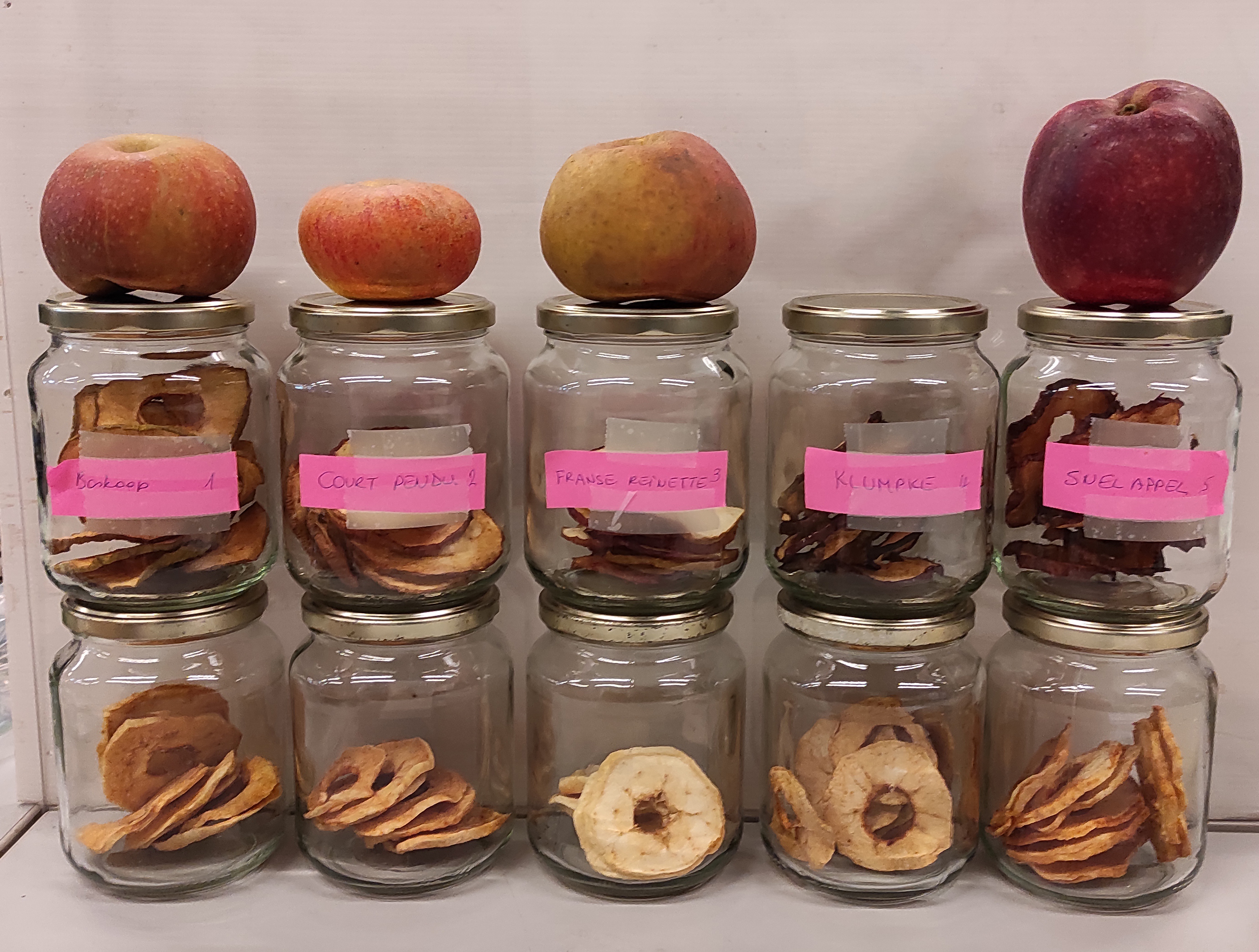 - Gehalte aan vruchtensuikers (bepalen de smaak van de appelschijfjes)